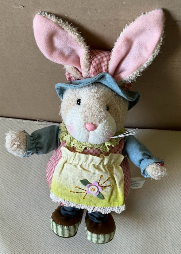 Dettagli del prodottoAdorabile coniglietto di peluche con cappellino e grembiule. Giocattolo musicale meccanico a batteria.