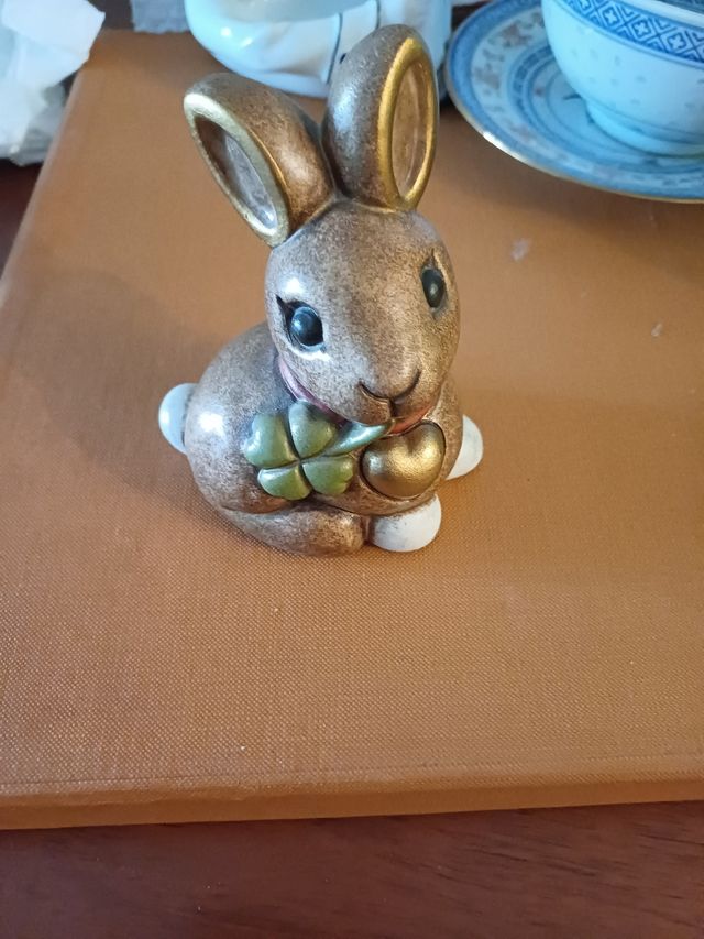Dettagli del prodottoBellissimo coniglietto Thun, in ceramica, raffigurante un coniglio seduto con un quadrifoglio e un cuore.