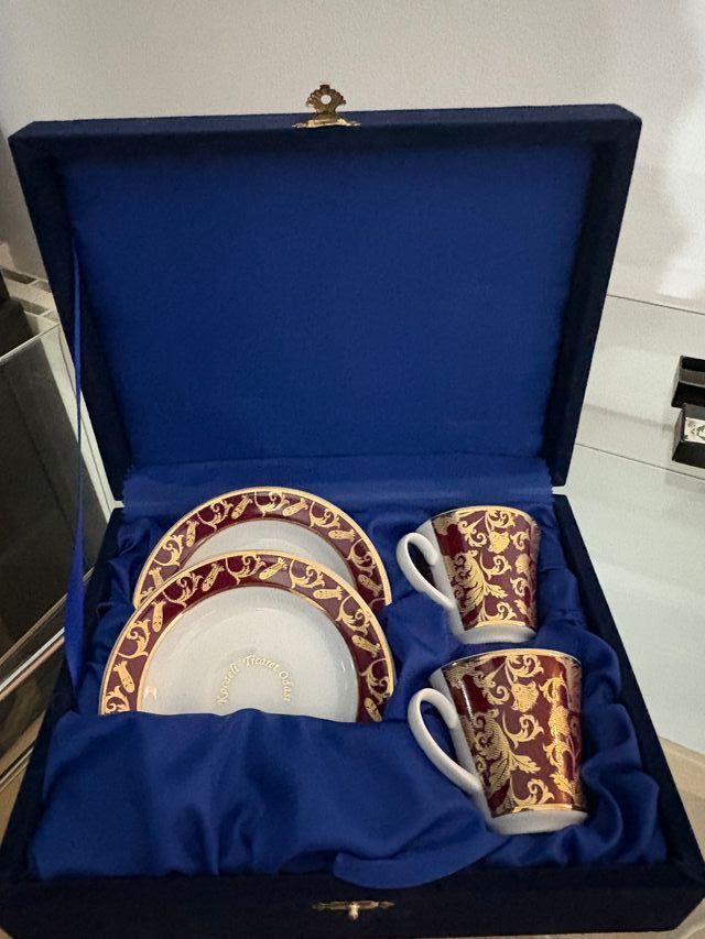 Dettagli del prodottoElegante set di due tazze con rispettivi piatti, realizzati in porcellana in Tailandia. Design con bordo granato e dettagli dorati. Include due tazze e due piatti. Presentato in una scatola di velluto blu. La descrizione è stata tradotta automaticamente.