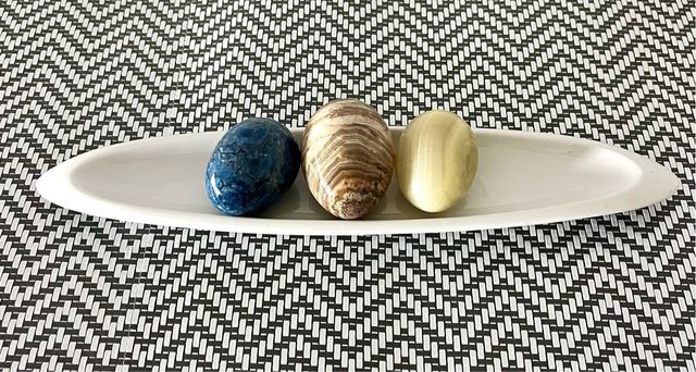 Dettagli del prodottoSet di tre uova decorative in alabastro. Con vassoio in ceramica bianca per esposizione.
