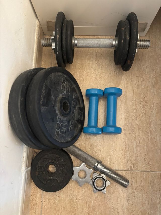 Dettagli del prodottoIn vendita set di pesi e manubri per l'allenamento a casa. - Barra di pesi con dischi. - Due piccoli manubri blu. - Dischi di diversi pesi. La descrizione è stata tradotta automaticamente.