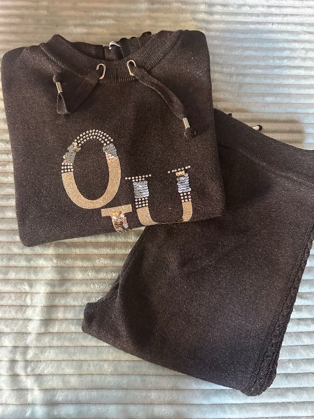 Dettagli del prodottoSet di due pezzi di maglieria con un design brillante. - Felpa con cappuccio e cordoncini. - Pantalone abbinato. - Dettaglio di strass e paillettes sulla felpa. - Il pantalone è taglia 12 e la felpa taglia 14. I pantaloni sono oversize, quindi la differenza di taglia. La descrizione è stata tradotta automaticamente.