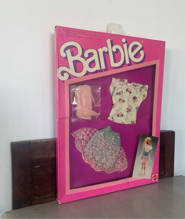 Dettagli del prodottoSet di abbigliamento per bambola Barbie di Mattel, anni '80. Include stivali rosa, top con stampa, gonna in pizzo grigia e rosa. La descrizione è stata tradotta automaticamente.