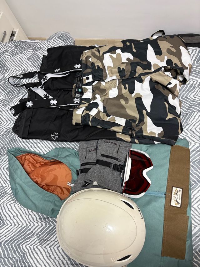 Dettagli del prodottoSet completo di abbigliamento e accessori per sciare. - Giacca mimetica. - Pantaloni neri con bretelle. - Guanti grigi. - Occhiali da sci. - Casco bianco. La descrizione è stata tradotta automaticamente.
