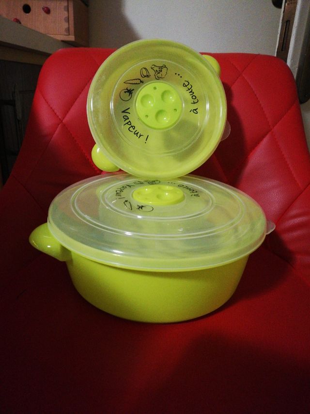 2 contenitori con coperchio. Si possono usare per cuocere in microonde a vapore. Il grande misura 22cm e il piccolo 16cm di diametro. Nuovi
