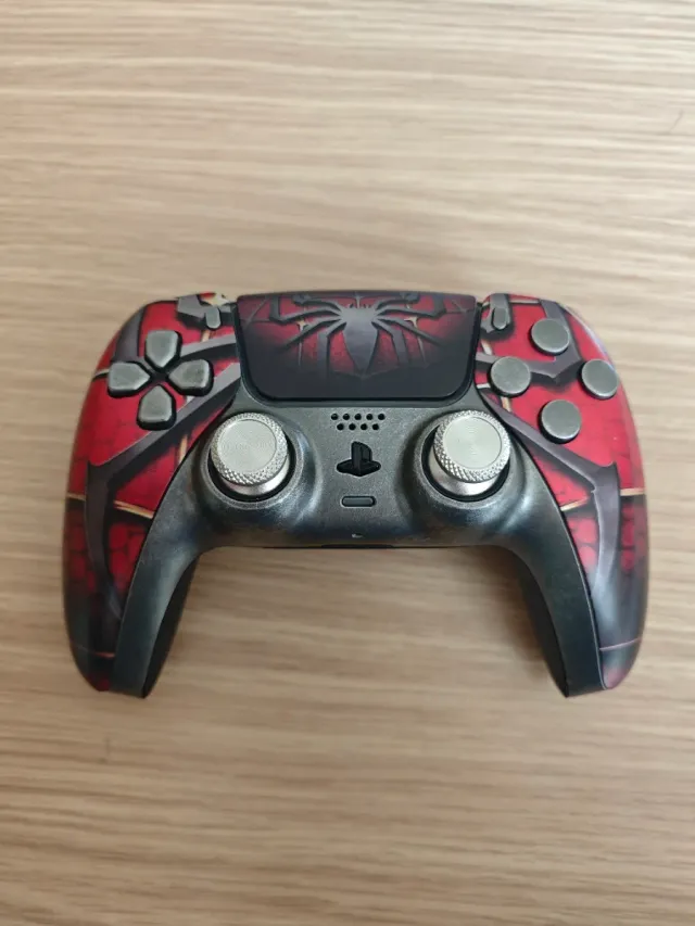 Controller Dualsense per PS5 con un design unico ispirato a Spider-Man. - Design personalizzato rosso e nero. - Dettagli metallici sugli stick analogici.