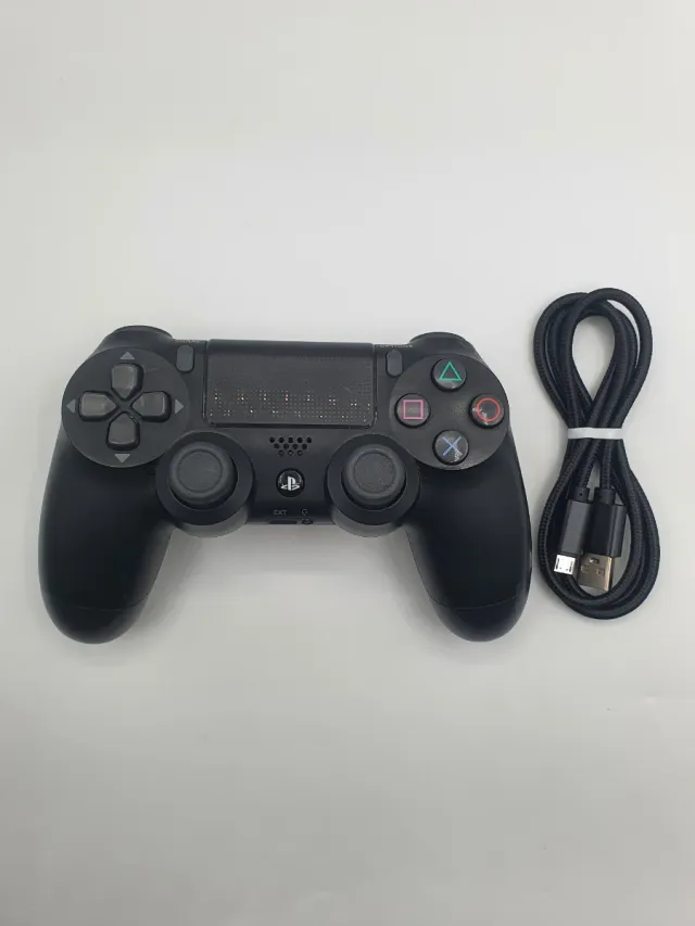 Controller Dualshock per PlayStation 4. Presenta diversi segni d'usura, vedere foto. - Colore nero. - Include cavo di ricarica compatibile.