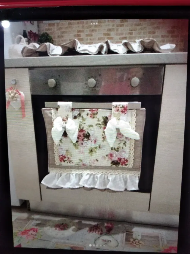 Set coordinato per la cucina con un grazioso motivo floreale. - Tessuto con stampa floreale. - Dettagli in pizzo e fiocchi. -
