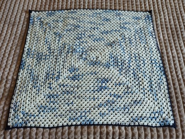 Copertina per neonato realizzata a mano con cura. Misura : 85 x 75 cm - Motivo a granny square. - Tonalità bianco e blu.