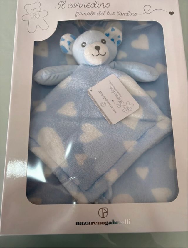 Dettagli del prodottoMorbida copertina per culla o lettino, con un adorabile dou dou a forma di orsetto azzurro. Perfetta per il riposo del tuo bambino.