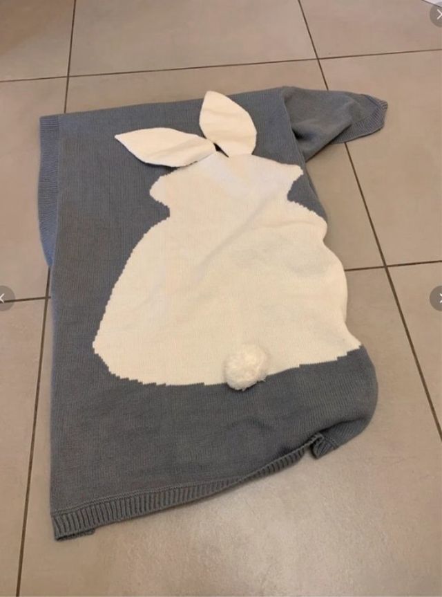 Morbida copertina per neonato in maglia grigia, decorata con un simpatico coniglio bianco. - Dettagli a forma di orecchie e codino. - Bordo rifinito a costine.