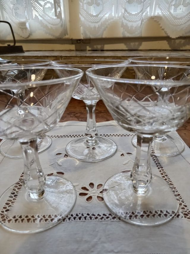 Vendo 5 coppe per champagne in vetro decorato. Diametro 10 cm Ottime condizioni