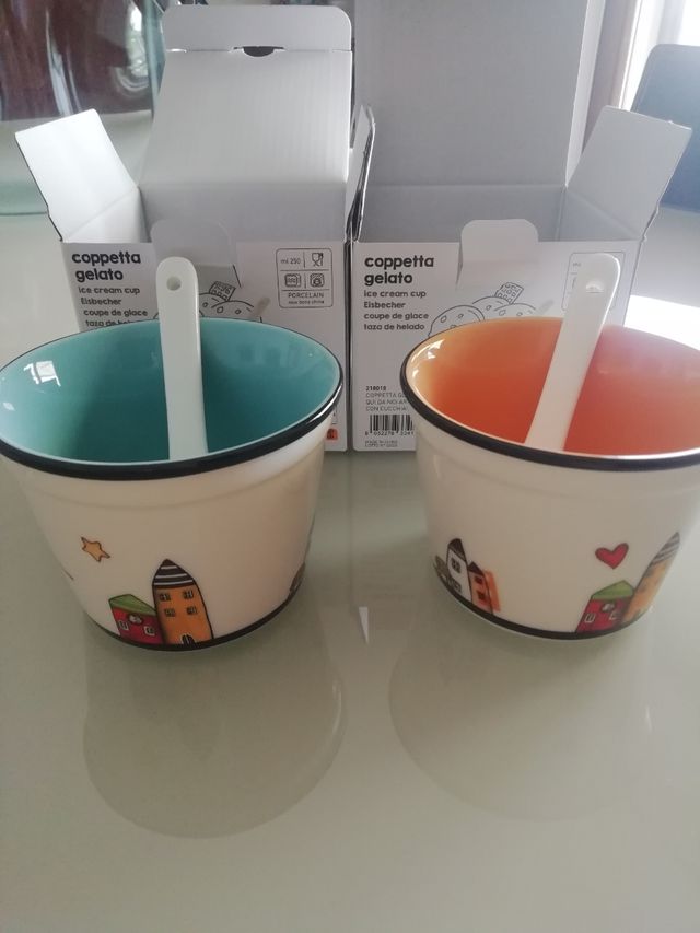 Dettagli del prodotto4 coppette gelato in porcellana complete di cucchiaini, (azzurro/verde/giallo/arancio)decoro Il villaggio a colori di EGAN Misure del prodotto