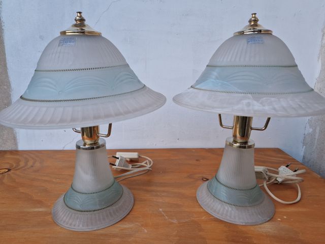 Dettagli del prodottoCedo due lampade- abatjour interamente in vetro opaco ed ottone. Le lampade riportano l'etichetta di Murano e sono provviste di interruttore a bilanciere sul filo. Impianto elettrico testato e funzionante. L'unica pecca è questa: una delle lampade riporta sul cappello una lesione abbastanza estesa ma non profonda. Decori in rilievo e marmorizzazioni completano il design . Misure del prodotto