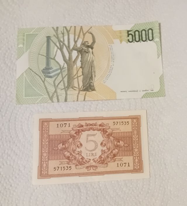 In vendita una coppia di banconote italiane. - Banconota da 5.000 Lire. - Banconota da 5 Lire.