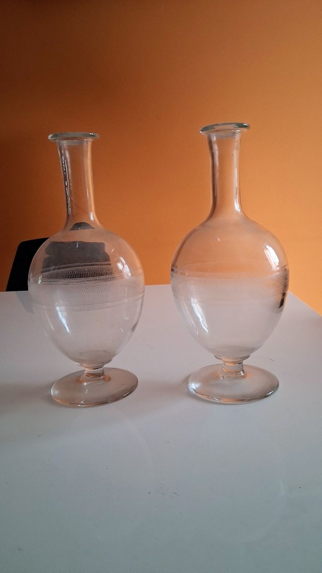 Dettagli del prodottoSet di due bottiglie in vetro trasparente, risalenti agli anni '50. Presentano un design classico con una base larga e un collo affusolato, impreziosite da una decorazione incisa nella parte superiore del corpo.