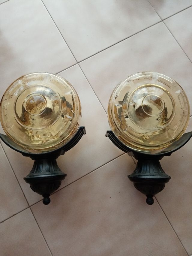 Dettagli del prodottoCoppia di applique per esterno con coppe originali, sani e perfetti. Coppe color ocra. Basi in ferro nero. Misure del prodotto