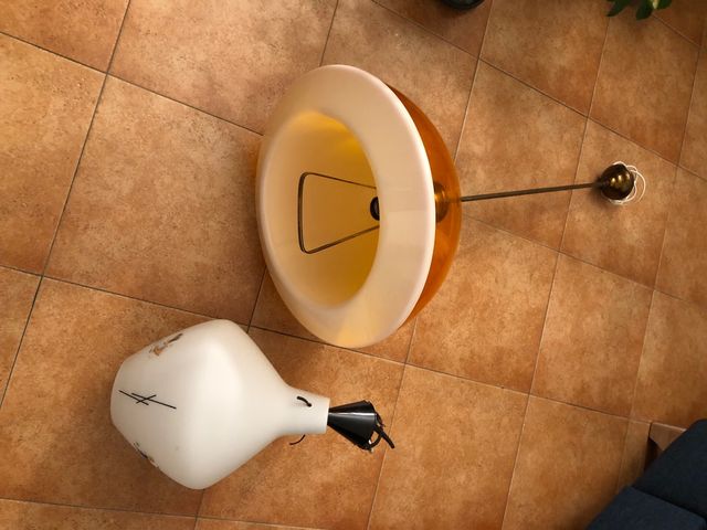 Coppia di lampadari vintage Quello arancione e bianco in plexiglas Quello bianco in vetro opaco con disegni