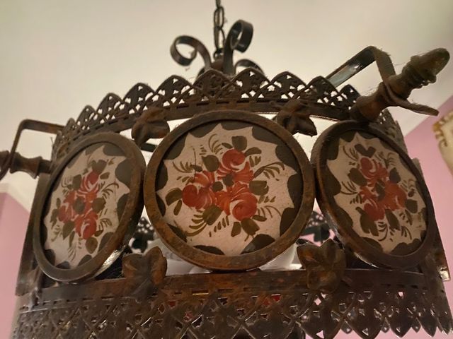 Dettagli del prodottoCoppia di lampadari Vintage in ferro battuto ed elementi decorativi in ceramica