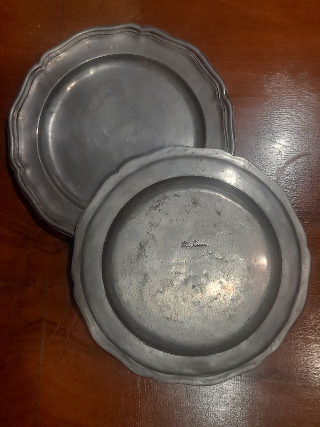 Dettagli del prodottoVendo coppia di piatti decorativi in peltro (anni '20-'30) con bordo smerlato, firmati a mano dal celebre artista italiano Nino Ferrari (1875-1941).