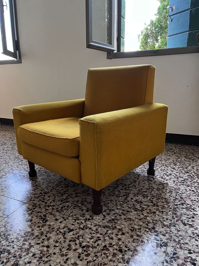 Dettagli del prodottoCoppia di poltroncine inizio anni 70 color ocra in buono stato. Dimensioni Base larghezza 76cm x 72cm altezza 74cm. Schienale larghezza 54cm, seduta 50 cm