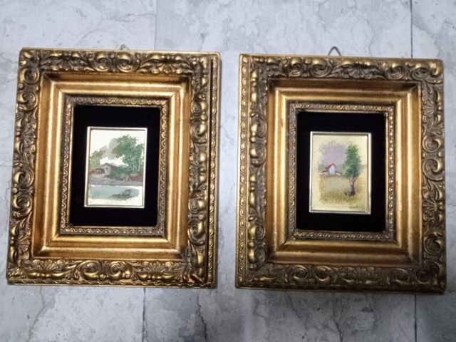 Coppia di quadri dipinti su foglia oro firmati Renè cm 19x22 vintage Misura esterna cm 19x22