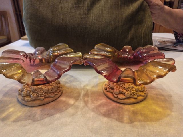 Dettagli del prodottoDeliziosa coppia di soprammobili in vetro soffiato con base in ceramica decorata.