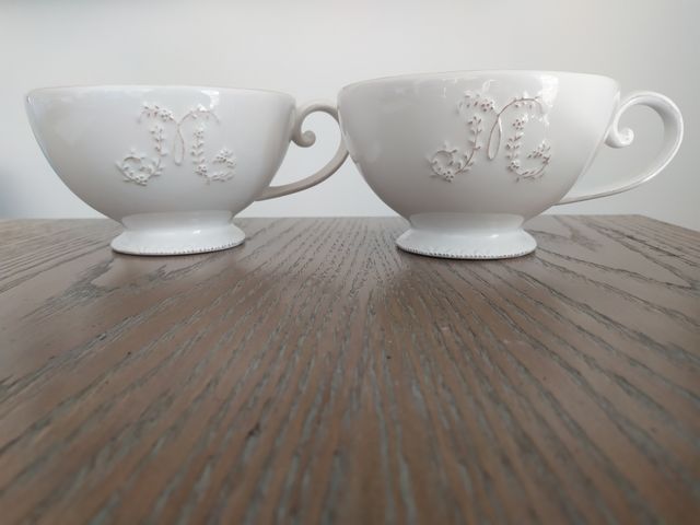 Dettagli del prodottoVendo bellissima coppia di tazze in porcellana bianca con manico, cm 15 di diametro, capacità 320ml, decorate marca Mason du Monde lavabili in lavastoviglie, nuove, come da foto.