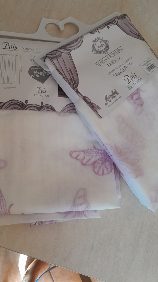 NuovoDettagli del prodottocoppia di tende Velate da arredo Marilyn sono due teli misura 140 * 280 di colore bianco con bellissimi disegni di farfalla ricamati di colore rosa lilla con anelli