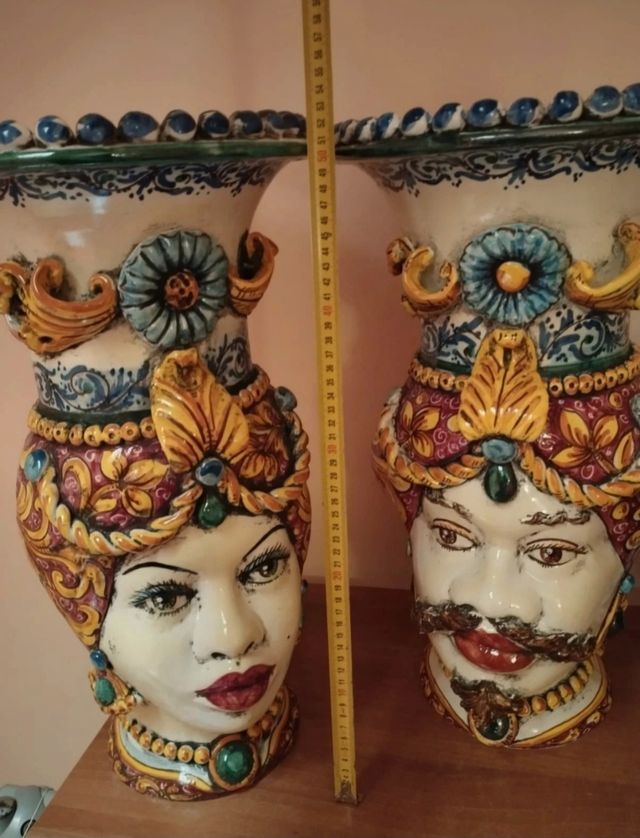 Dettagli del prodottoMeravigliose Teste di Moro siciliane di Altezza 53 cm. e Diametro 30 cm. Ceramiche artistiche uniche ed originali: arrederanno la vostra casa con classe ed eleganza! Si possono pure utilizzare come portavasi per inserirvi all'interno delle belle piante ornamentali. Pesano circa 7 kg. ciascuna. Fatte a mano e con il cartellino di autenticità dell'artista incluso. Misure del prodotto