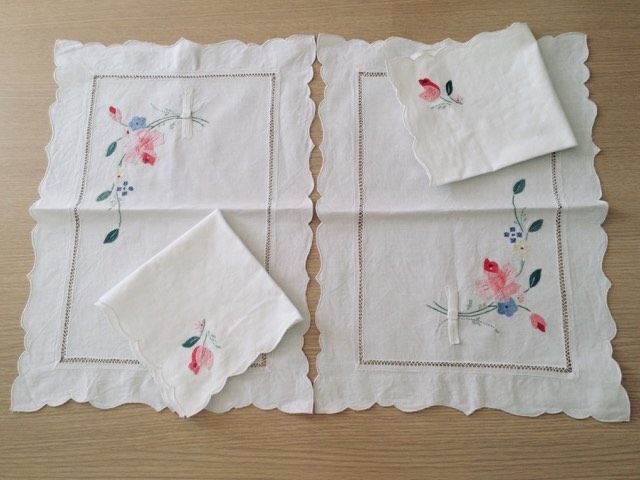 coppia di tovagliette con tovaglioli ricamate a mano in puro cotone misure tovaglietta cm. 48 x 34 misure tovaglioli cm. 34 x 34