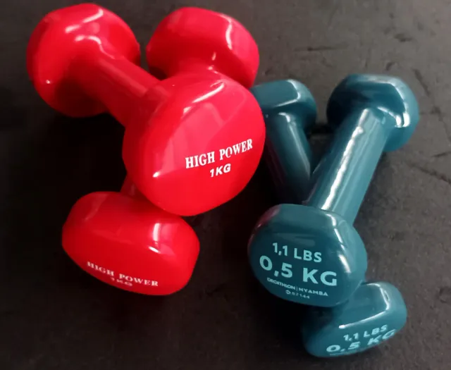 Dettagli del prodottoSet di manubri per allenamento, composti da una coppia da 0,5 kg e una coppia da 1 kg.