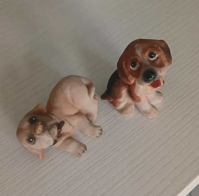 Deliziosa coppia di miniature in resina raffiguranti due cagnolini. - Un labrador e un beagle, nessuna scheggiatura o rottura, misure in foto.