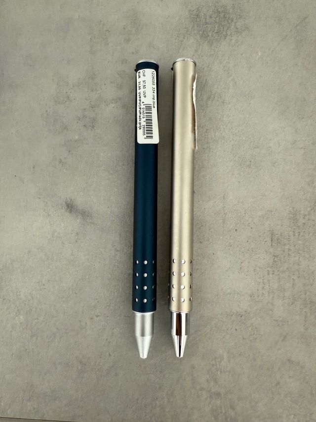 NuovoDettagli del prodottoSet di due penne, una blu e una color argento. Entrambe presentano un design con puntini traforati nella parte superiore.