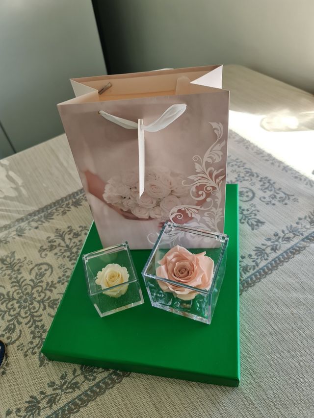 Coppia Rose stabilizzate 6x6x6cm + 8x8x8cm complete di shopper per regalo