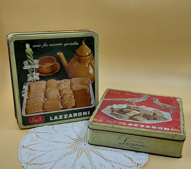 Dettagli del prodottoPer amanti del genere e collezionisti ecco una coppia di scatole in latta del famoso marchio di biscotti e dolciumi Lazzaroni originali anni '70.