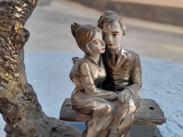 Deliziosa statuetta di una coppia seduta su una panchina, con un albero stilizzato. - Materiale: metallo - Dettagli dipinti a mano