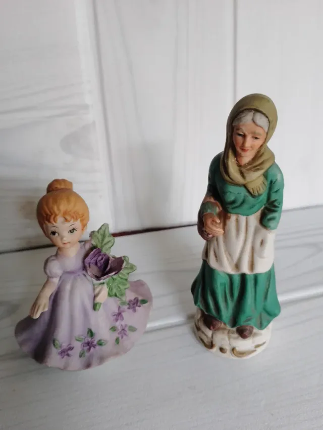 Deliziosa coppia di piccole statuette in ceramica. - Una bambina con abito viola e fiori. - Un'anziana signora con scialle verde.