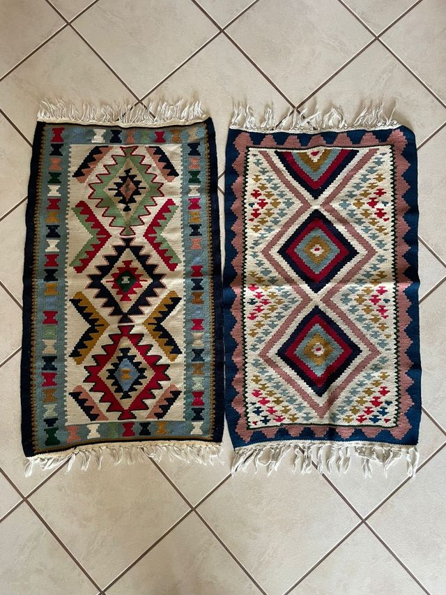 Tappeti etnici fatti a mano.Misurano 95 x 57 cm senza frangia, la misura è approssimativa in quanto essendo fatti a mano sono irregolari. Vendibili anche singolarmente.