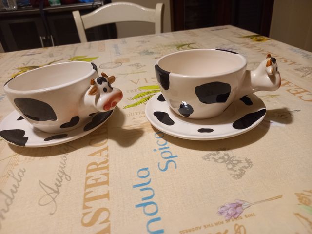 Set 2 tazze in ceramica con piattino. Manico mucca e tazza e piattino maculati. Ceramica Nuovo mai usato