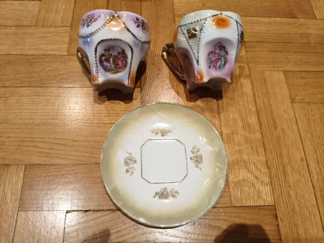 Dettagli del prodottoElegante coppia di tazze da tè con piattino risalenti agli anni '20. Presentano decorazioni raffinate.