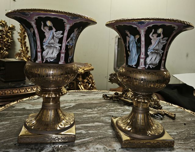 Dettagli del prodottoElegante coppia di vasi in stile Impero, con finiture dorate e decorazioni dipinte a mano. Perfetti per aggiungere un tocco di classe a qualsiasi ambiente.