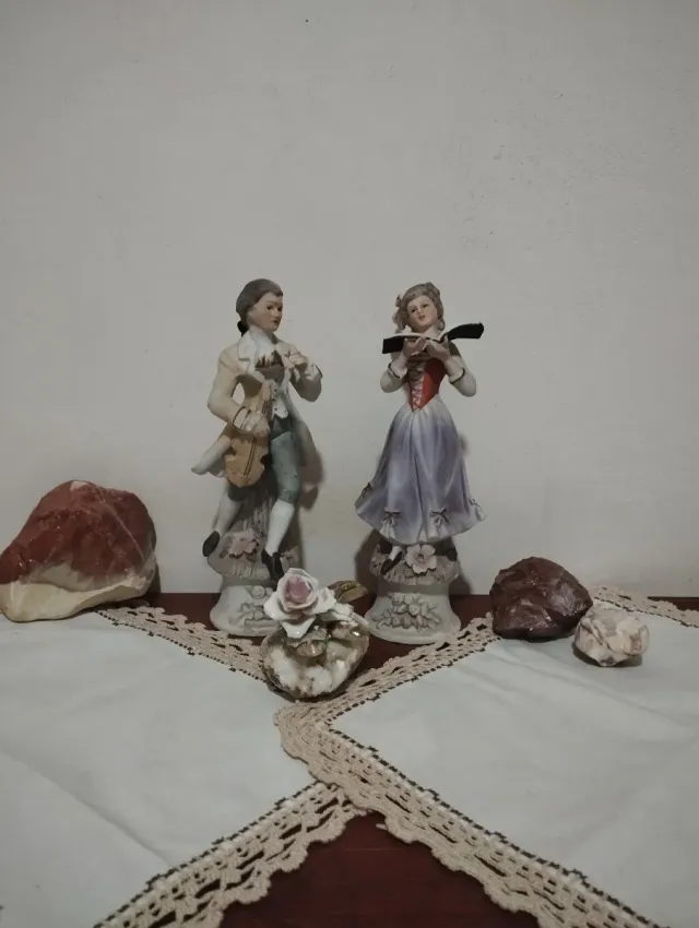 Dettagli del prodottoDeliziosa coppia di statuine in ceramica raffiguranti due ragazzi d'epoca. Perfette per aggiungere un tocco di eleganza. Misura circa cm 20. Sono di Capodimonte ma lo stemma è andato via dopo tantissimi anni di lavaggio.Manca al ragazzo un pezzo del violino vedete l'ultima foto.