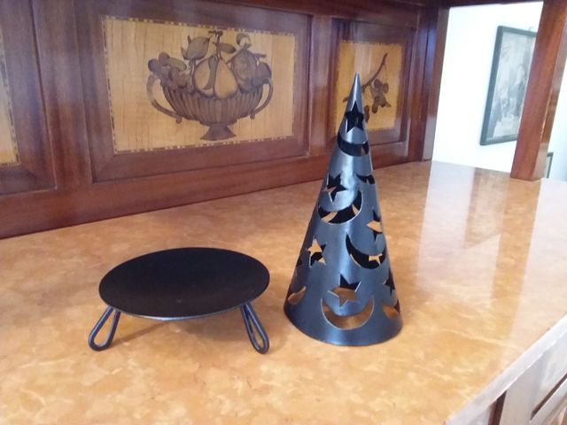 Un copricandela in ferro leggero colore grigio scuro, con inserti a forme di lune e di stelle che proiettano belle immagini sulle pareti. Altezza totale 24 cm.