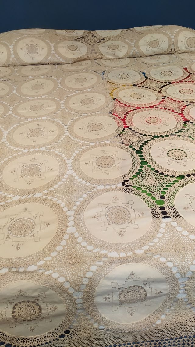 Splendido copriletto matrimoniale: lavorazione mista con uncinetto e ricamo. Viene fuori dal baule della nonna senza mai essere stato usato.