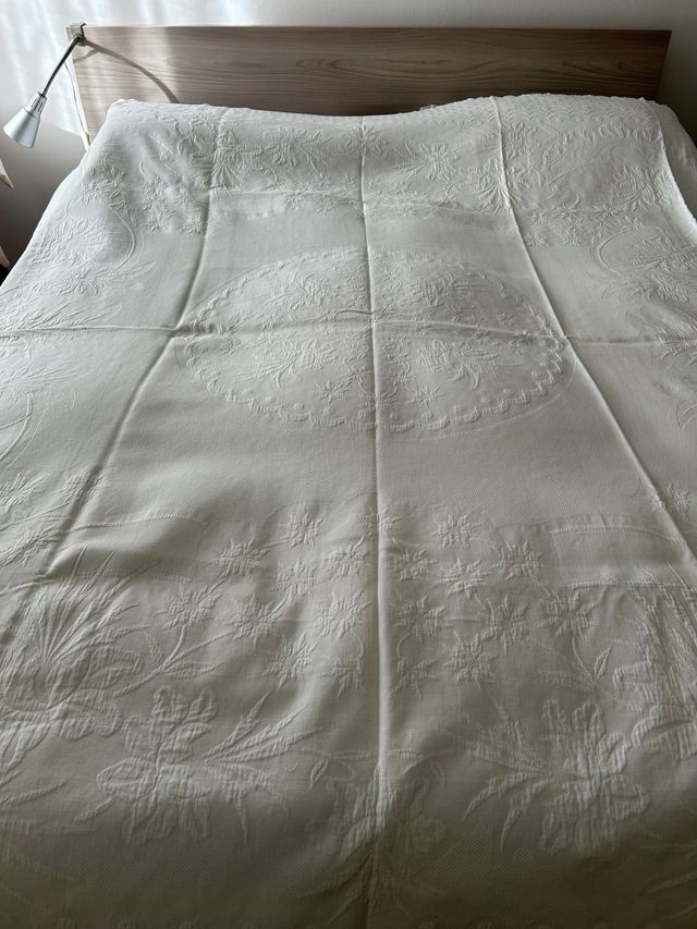 Dettagli del prodottoCopriletto in piquet di cotone lavorato bianco, smerlato sui 4 lati; misure 225x250