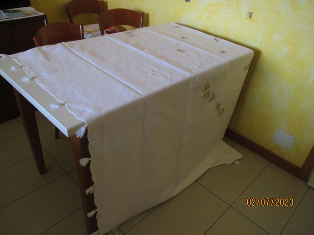Dettagli del prodottoCopriletto matrimoniale bianco, 100% cotone, ricami floreali colorati a mano e motivo campestre nella trama del cotone, 240x230 cm. Usato ma in ottimo stato