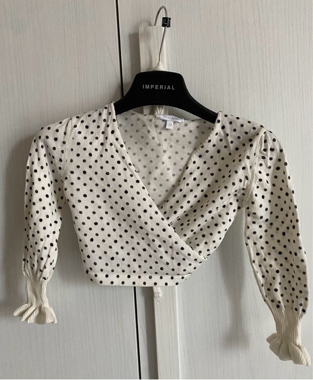 Dettagli del prodottoDelicato coprispalle a pois per bambina, taglia  32, 6/7  anni, marca Miss Grant, usato ma in buono stato, tessuto 100% cotone, colore panna, fantasia con piccoli pois neri, strass applicati, allacciatura con incrocio, misure: spalle cm 30, larghezza cm 33, lunghezza cm 26, manica cm 33 ( art 93 nero) W