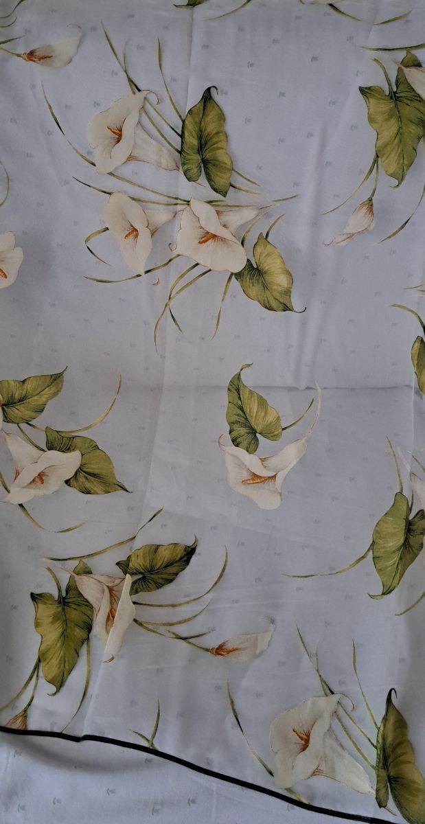 Dettagli del prodottoCopritavolo trasparente in tessuto con motivi di gigli.