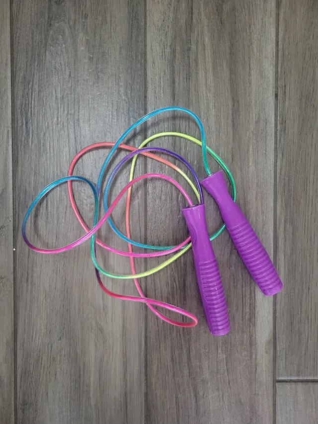 Dettagli del prodottoCorda per saltare con manici viola e corda arcobaleno.